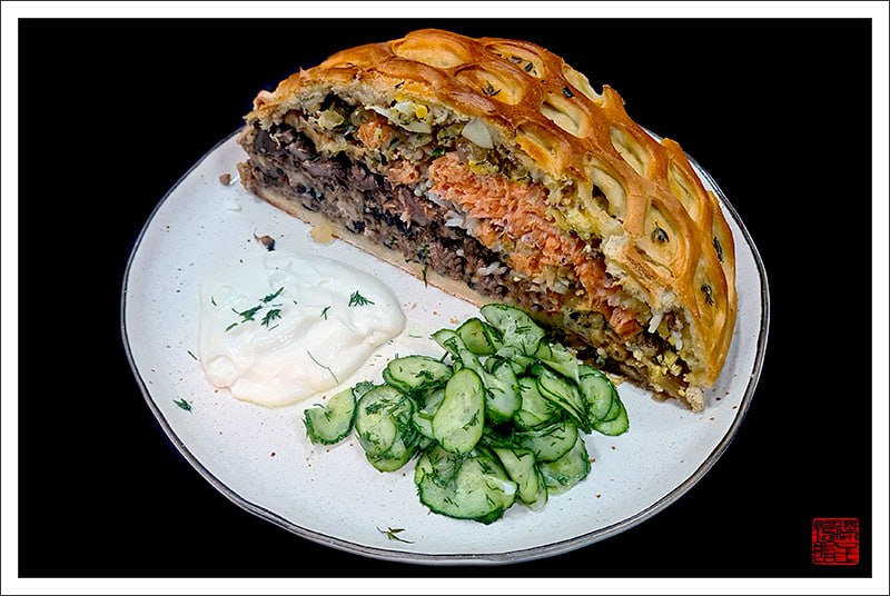 «Иногда позволял себе отступление, заменяя расстегаи байдаковским пирогом – огромной кулебякой с начинкой в двенадцать ярусов, где было все, начиная от слоя налимьей печенки и кончая слоем костяных мозгов в черном масле… каждый слой – своя начинка; и мясо, и рыба разная, и свежие грибы, и цыплята, и дичь всех сортов. Эту кулебяку приготовляли только в Купеческом клубе и у …
